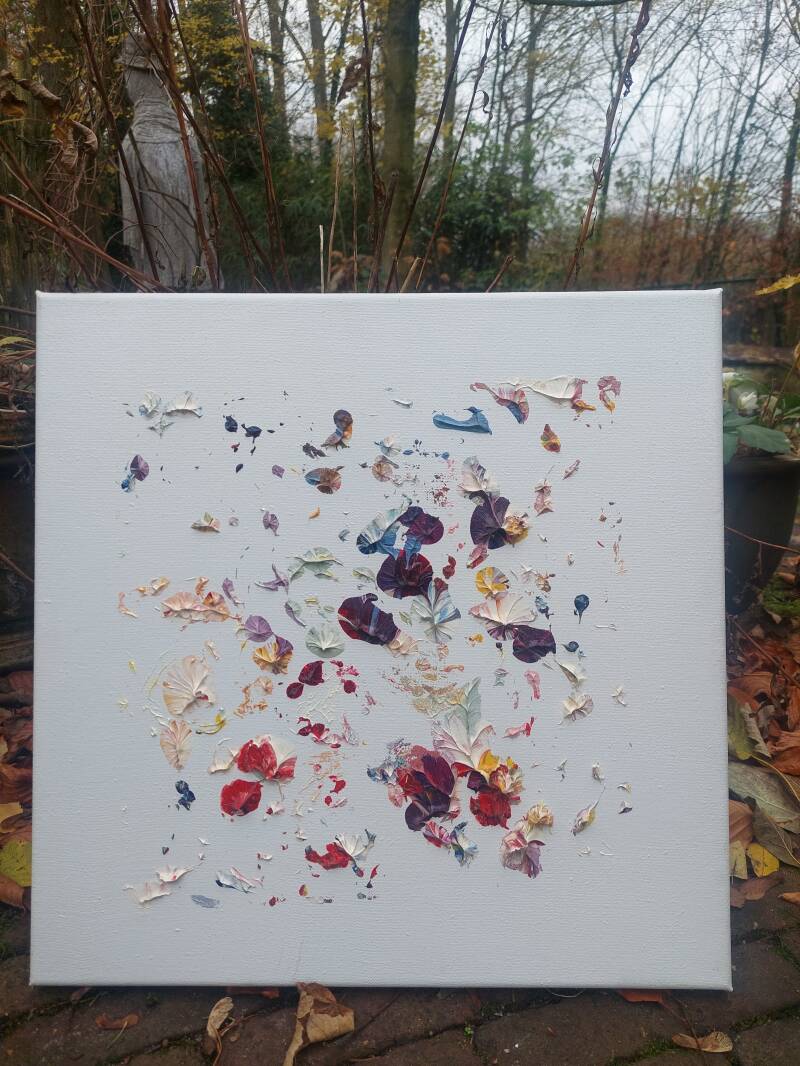 Een boeket waarvan de kern is gegrepen. Het is een juweeltje aan de muur, te vergelijken met een boeket in huis, dat je emoties opent en je gevoel een positieve wending geeft. Ontdek de schoonheid en tederheid van Carie's juweeltjes/boeketten.