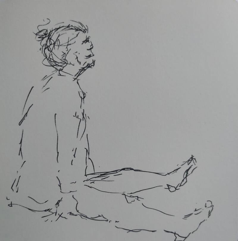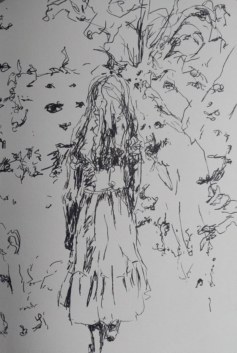 Toen ik dit model aan het tekenen was, ontving ik al iets meer informatie dan alleen een meisje dat met haar hoofd op een zelfgevouwen kussen van haar ochtendjas lag. Er kwam ‘sterrenstof’ op haar ogen te liggen. Dan is er meer aan de hand.